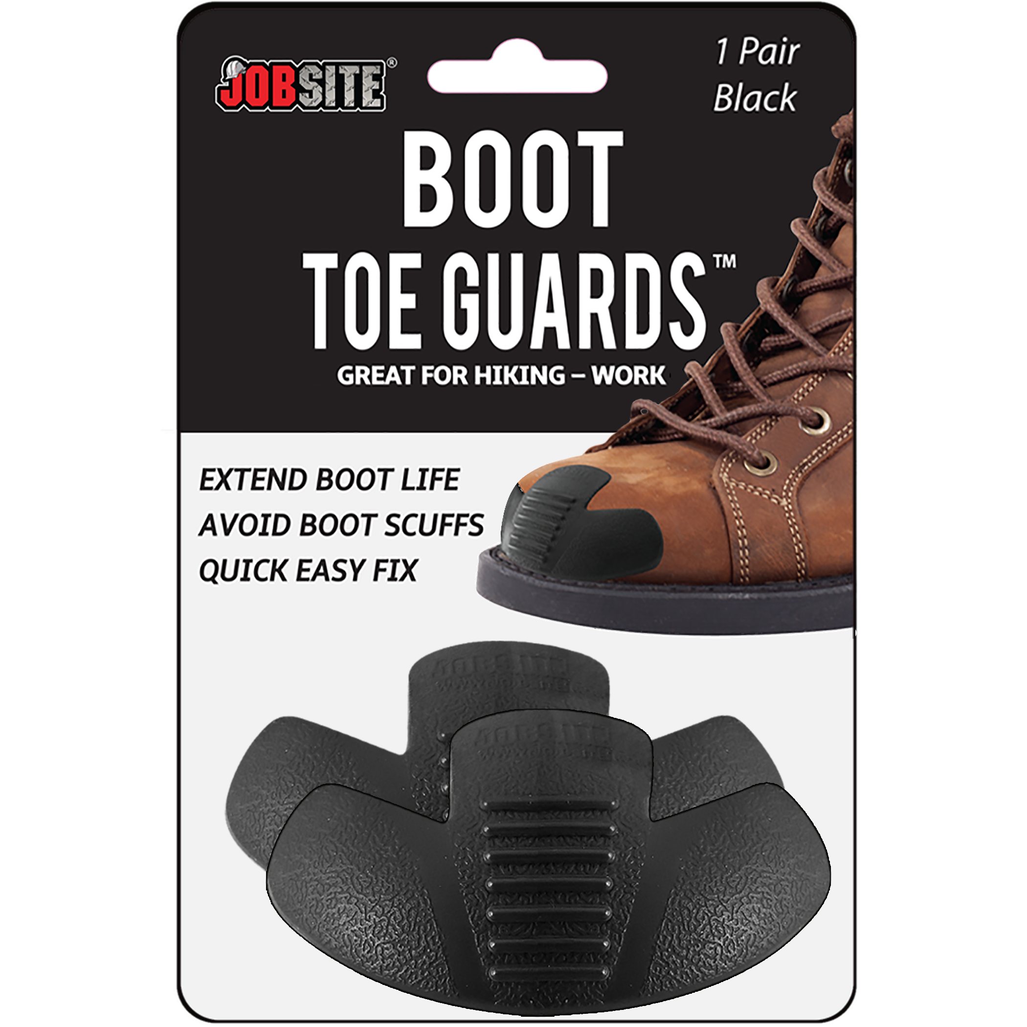 JobSite Heavy Duty Boot Toe Guards will save your boots. These boot toe protector covers will extend boot life & protect against boot scuffs. If you already have damage on the toes of your boots, the toe guards can help hide the damage and protect against further damage. Includes sand paper and glue for installing. Directions: Do outdoors, well ventilated. Pencil trace light outline of toe guard on boot toe. Rough up area with enclosed sandpaper. Make sure surface is clean and dry. Sqeeze glue onto underside of each boot guard and also inside traced area of boot surface. Spread the glue evenly. Let the toe guards and the boot surface set for 3 minutes, until the glue is tacky. Firmly press toe guards onto traced area of the boot toes. Let dry for 24 hours before use.