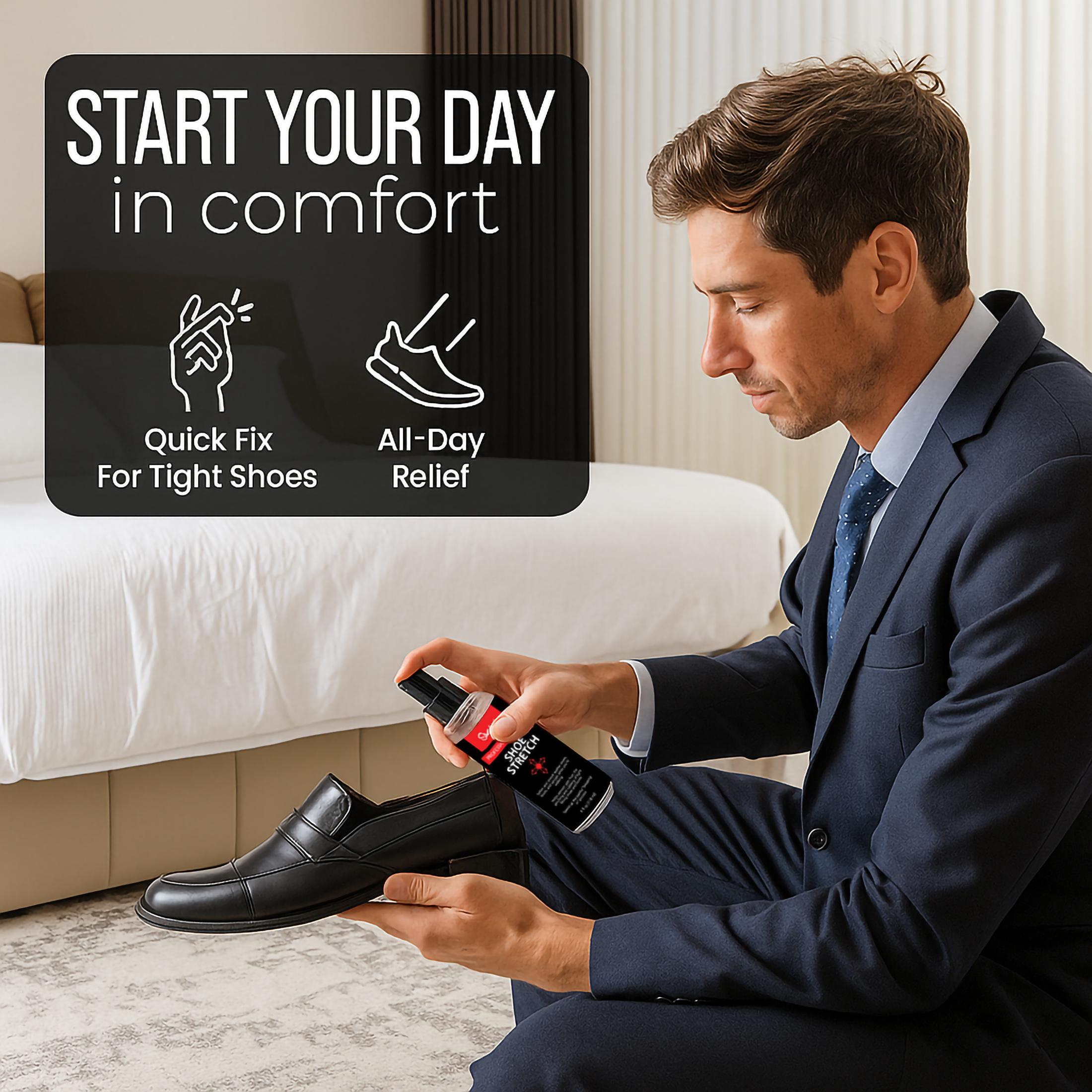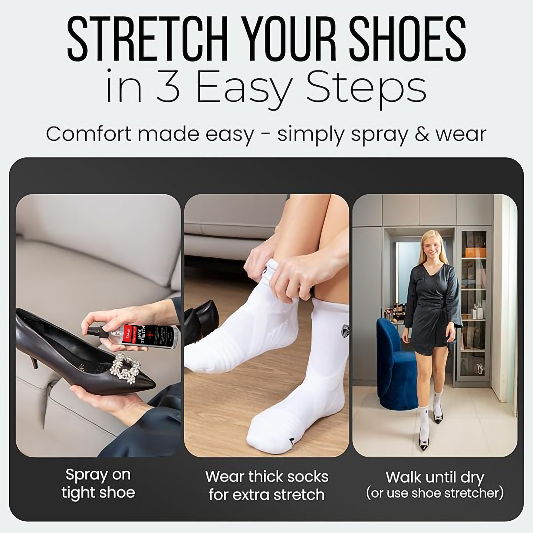 - Spray on to stretch your shoes while you walk or use with a Professional Shoe Stretcher